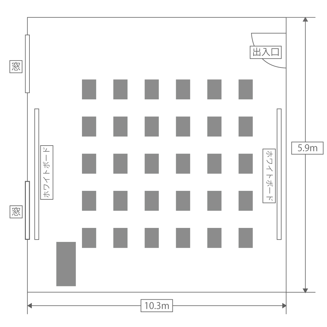 定員 : 30名 ※スクール形式での定員です。収容人数はレイアウトによって変わります。